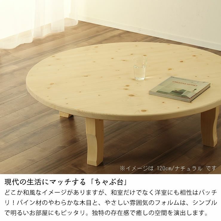 古くから日本の食卓テーブルとして使われてきた「ちゃぶ台」。どこか和風なイメージがありますが、和室だけでなく洋室にも相性はバッチリ!どっしりとした重厚感と、節のある天板のナチュラル感で、お部屋に落ち着きのある雰囲気をつくってくれます。パイン材のやわらかな木目と、やさしい雰囲気のフォルムは、シンプルで明るいお部屋にもピッタリ。独特の存在感で癒しの空間を演出します。