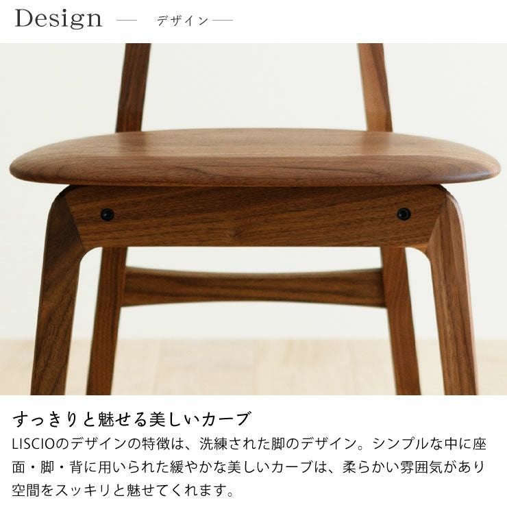 なめらかで美しい曲線が特徴のLISCIO(リッショ)シリーズ。また、座面と背もたれ、脚の2ヶ所の材を4種類からお選び頂け、お好みの組合せをお楽しみ頂けます。ハの字になったスリムな脚は、座った際に足元が広く感じられ、足に沿うなめらかな座面は座りやすさもあります。ダイニングテーブルと合わせてもスッキリとした印象で、圧迫感を与えません。