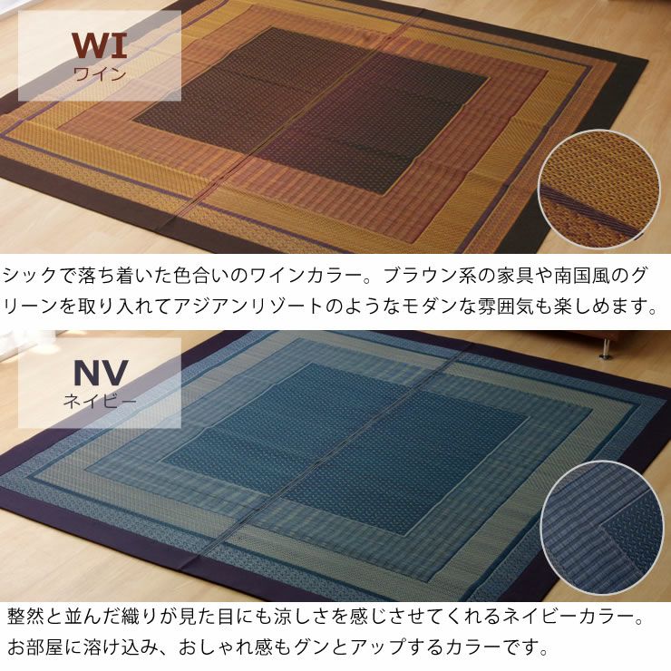 色合いが微妙に異なるい草を技巧的に編み込んだ、上品で雰囲気のあるモダンデザインのい草ラグです。