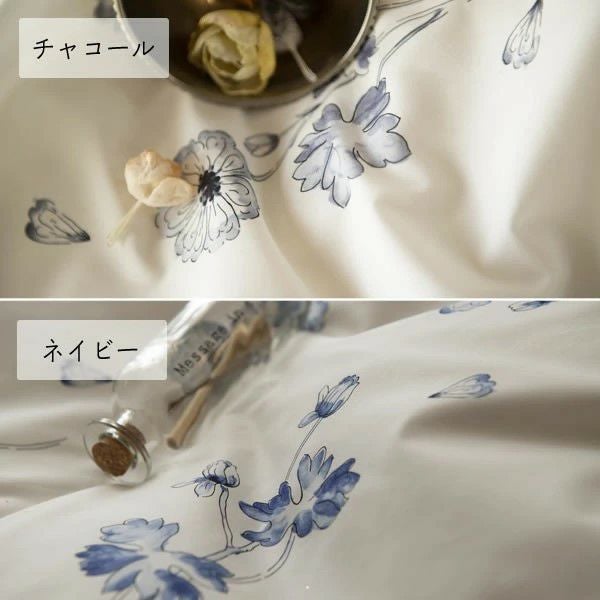 アンティークの植物画のような優雅で美しい花姿を、ワントーンの水彩絵の具で色づけした、シックでシンプルなベッドリネンです。