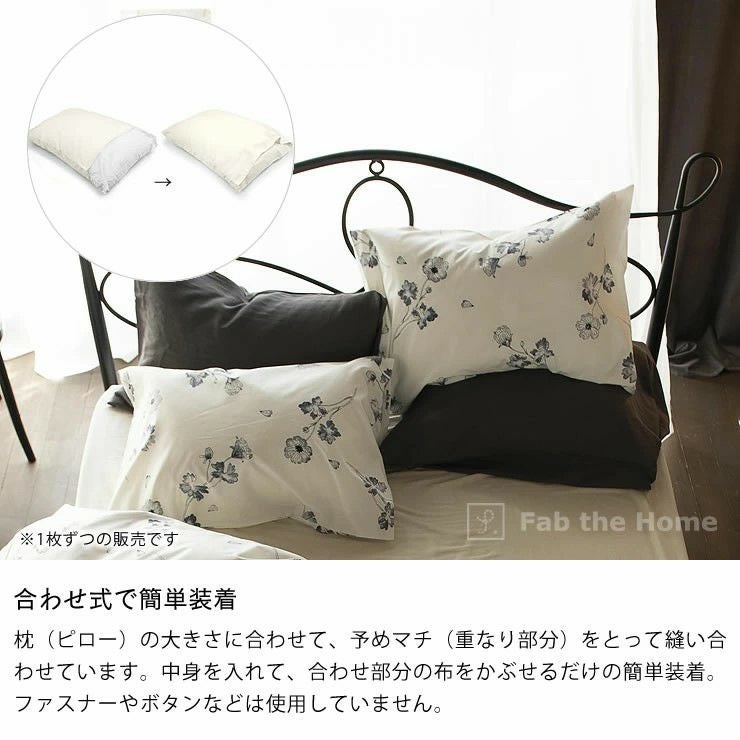 枕(ピロー)の大きさに合わせて、予めマチ(重なり部分)をとって縫い合わせています。中身を入れて、合わせ部分の布をかぶせるだけの簡単装着。ファスナーやボタンなどは使用していません。