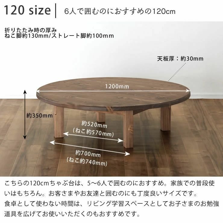 | サイズ | 直径約1200×高350(mm) 天板厚:約30(mm) 折りたたみ時の厚み:猫脚約130(mm)/ストレート約100(mm) |