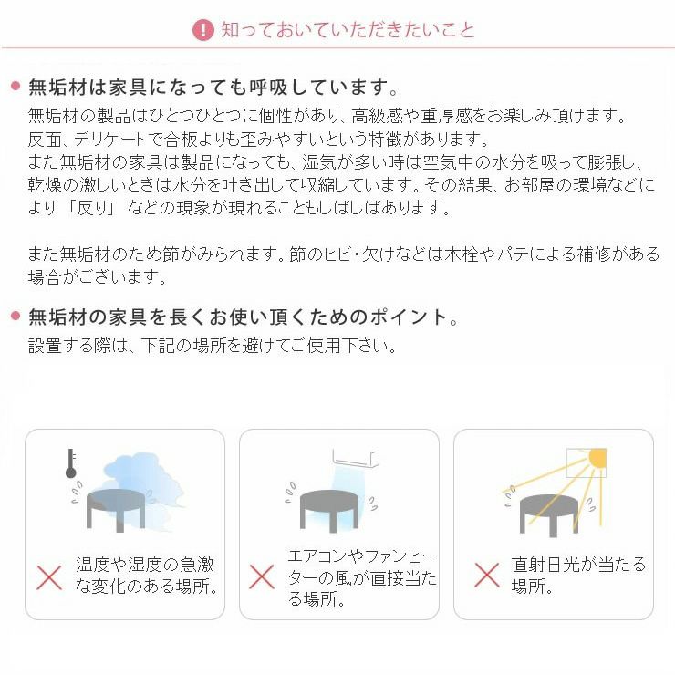 無垢材の製品はひとつひとつに個性があり、高級感や重厚感をお楽しみ頂けます。