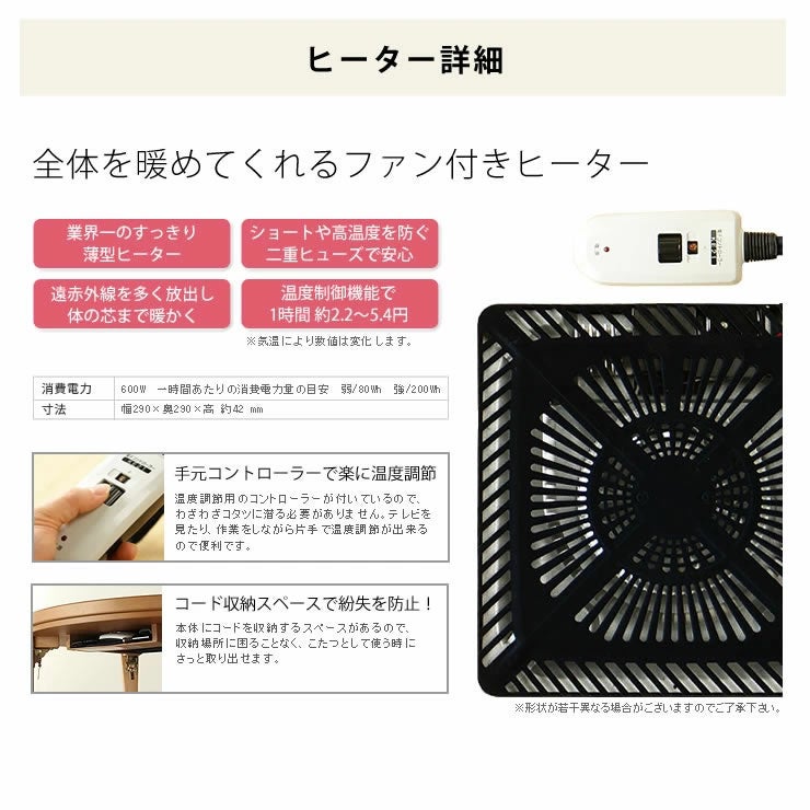ヒーターをU字形に曲げて発光長を長くし、さらにファンモーターがこたつ内部の空気を攪拌することにより、こたつの中をムラなく効率的に暖めることができます。