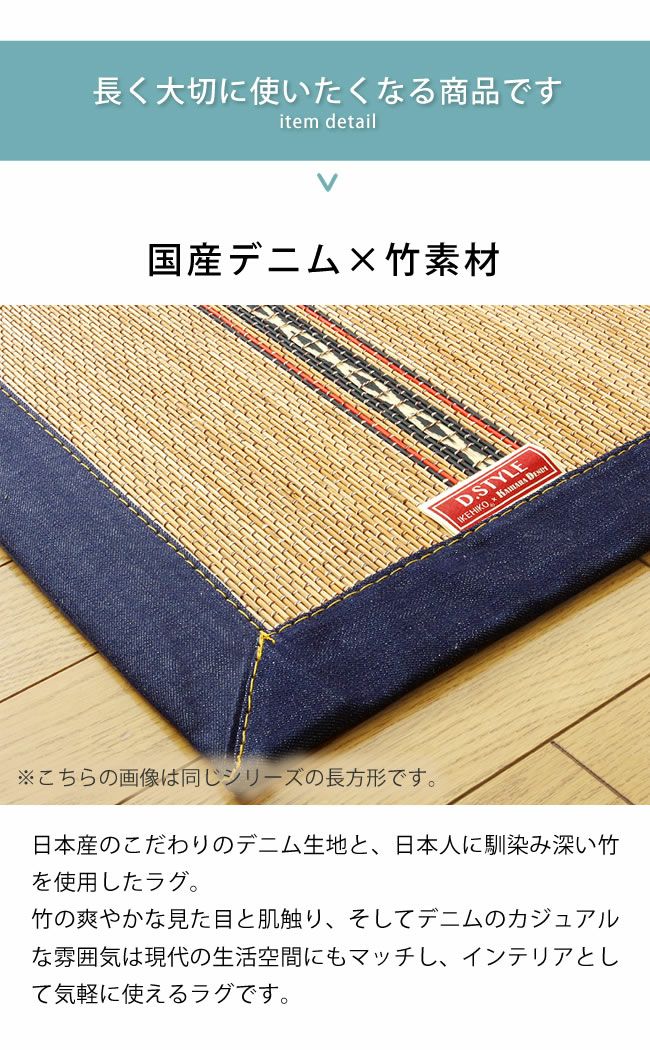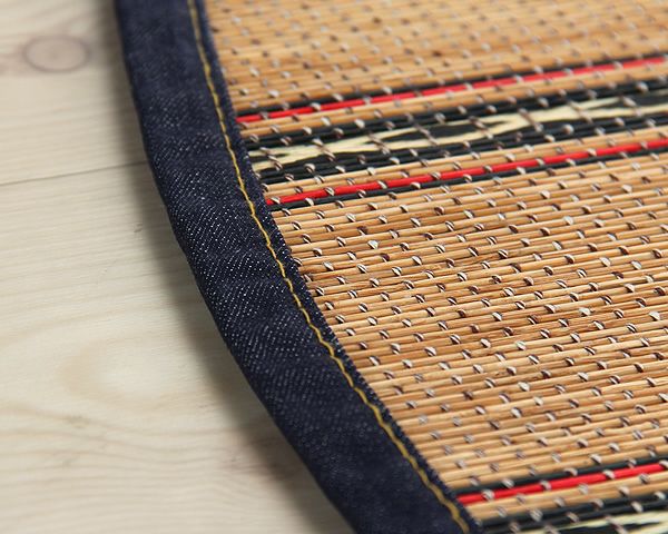 日本産の品質にこだわった丈夫なデニムを縁に使用した、インテリアとしてラフに楽しめるカジュアルスタイルの竹の竹のラグ。竹は古来より親しみがあり、様々な形で愛されてきた素材です。竹のもつひんやり感としなやかさは使い心地がよく、また丈夫な素材なので長くお使いいただけます。