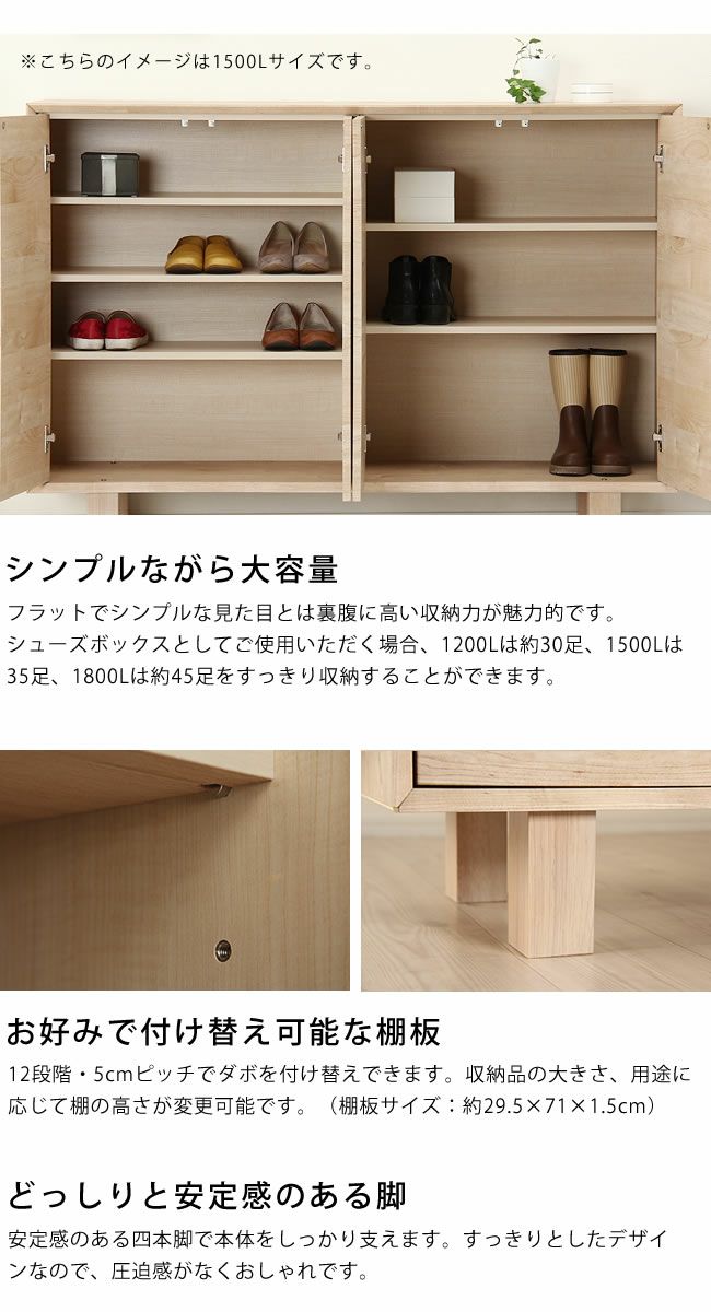 フラットでシンプルな見た目とは裏腹に高い収納力が魅力的です。シューズボックスとしてご使用いただく場合、1200Lは約30足、1500Lは35足、1800Lは約45足をすっきり収納することができます。