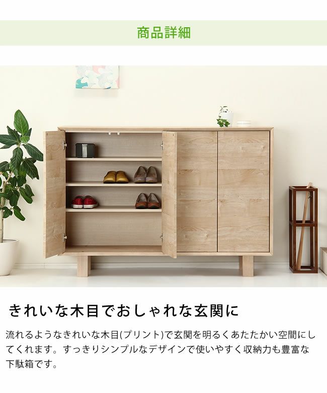シンプルさとナチュラルさが融合したデザインのシューズボックス。どっしりとしたフォルムで安定感があります。玄関だけでなくリビングボードとしてのご使用も可能です。