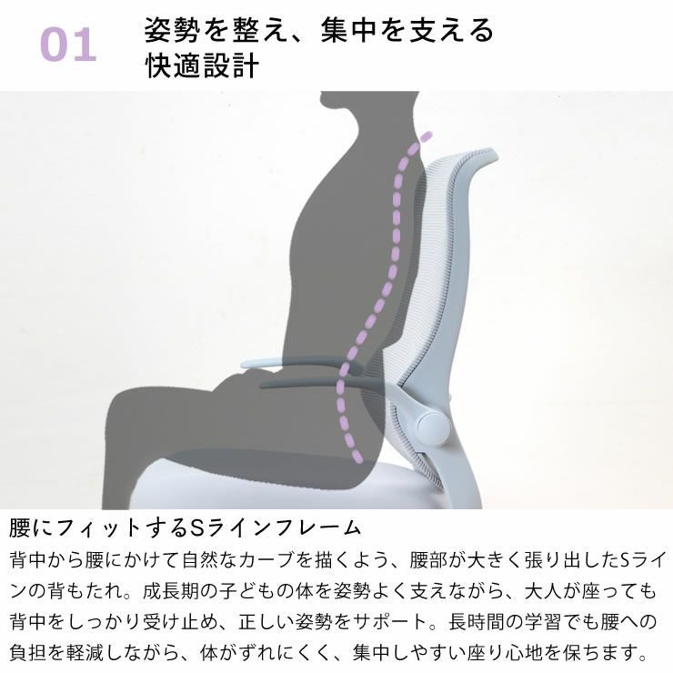体にフィットする背もたれが成長期のお子さまや、デスクワークをする大人を体を優しく支え、長時間の学習・作業でも姿勢が崩れにくい設計になっています。