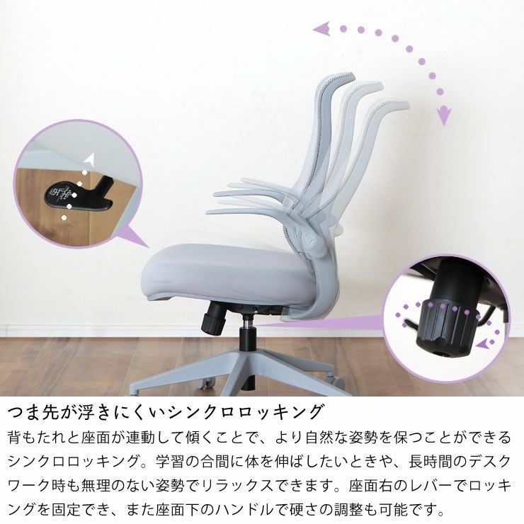学習時や作業時に肘を支え、体の負担を和らげてくれるアームレスト。上に跳ね上げることができるので、チェアを使わないときは、引き出し付きの学習机でもチェアをデスク下にすっきり収納できます。また跳ね上げたまま使えば、座りながら自由な姿勢を取ることも。