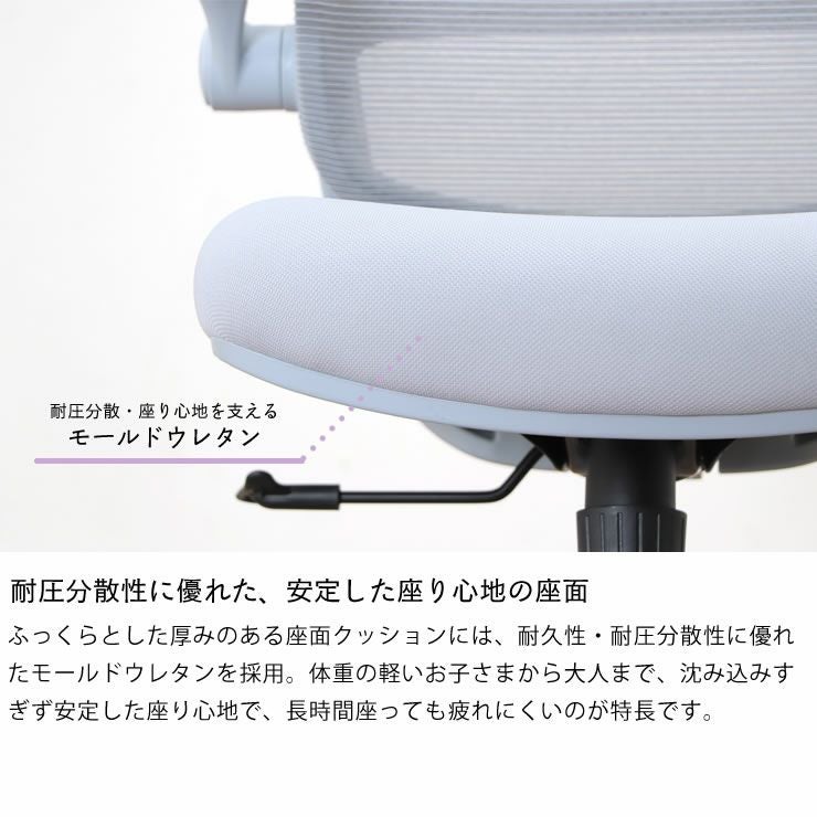 ふっくらとした厚みのある座面クッションには、耐久性・耐圧分散性に優れたモールドウレタンを採用。体重の軽いお子さまから大人まで、沈み込みすぎず安定した座り心地で、長時間座っても疲れにくいのが特長です。