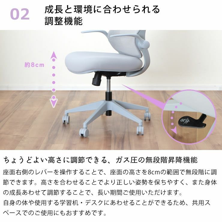 座面右側のレバーを操作することで、座面の高さを8cmの範囲で無段階に調節できます。高さを合わせることでより正しい姿勢を保ちやすく、また身体の成長あわせて調節することで、長い期間ご使用いただけます。