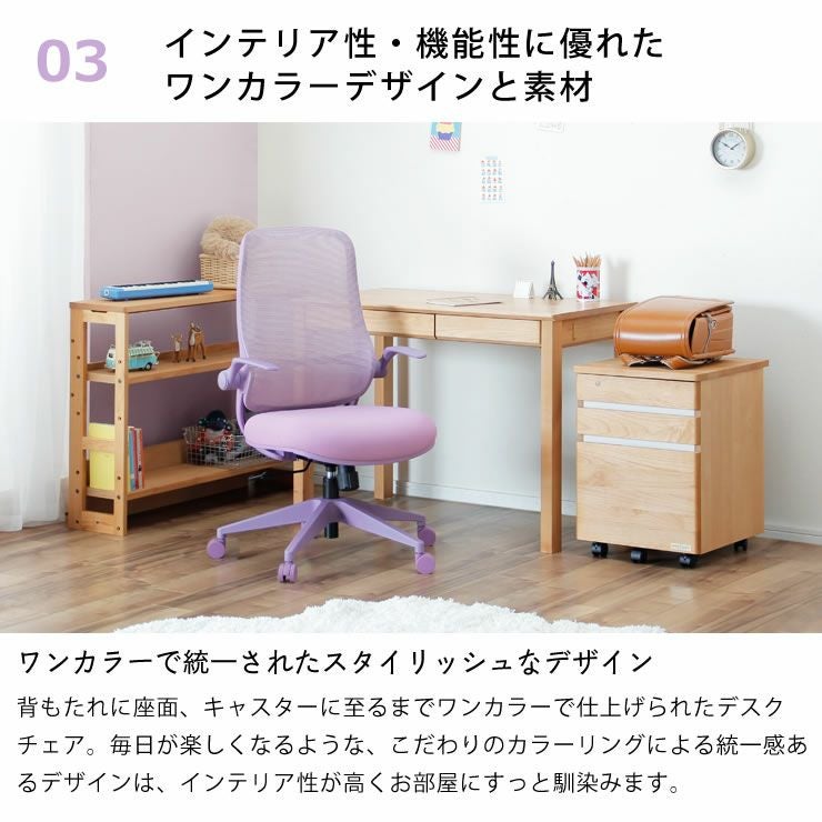 背もたれに座面、キャスターに至るまでワンカラーで仕上げられたデスクチェア。毎日が楽しくなるような、こだわりのカラーリングによる統一感あるデザインは、インテリア性が高くお部屋にすっと馴染みます。学習机にあわせるチェアとして、またお自宅でのワークスペース用におすすめです。