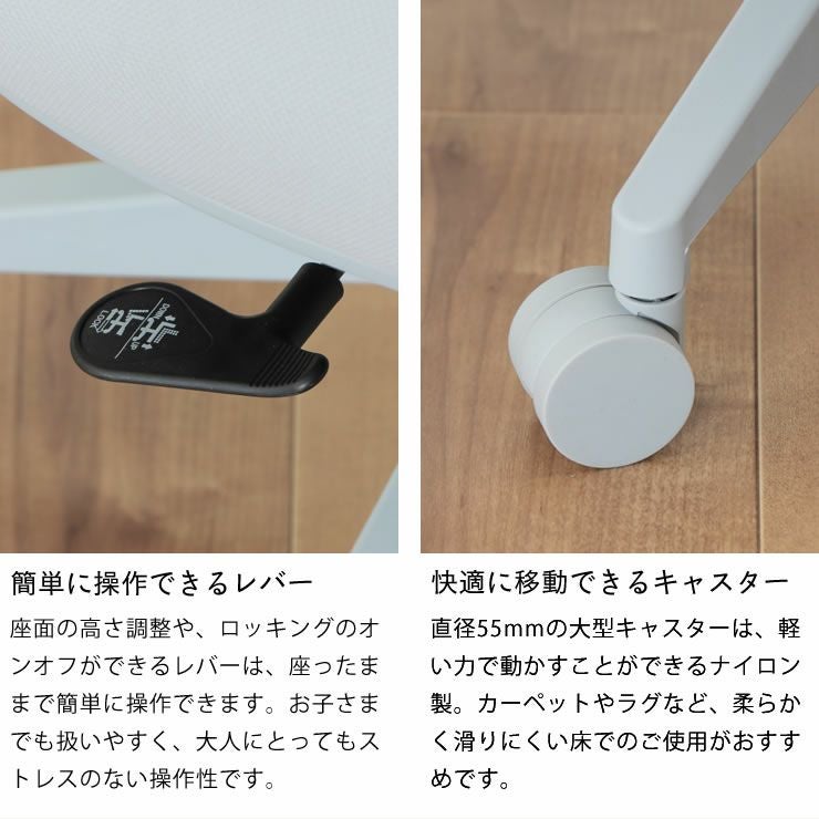 座面の高さ調整や、ロッキングのオンオフができるレバーは、座ったままで簡単に操作できます。お子さまでも扱いやすく、大人にとってもストレスのない操作性です。