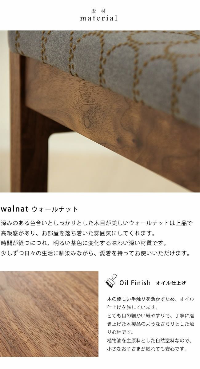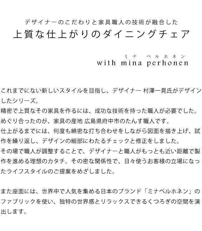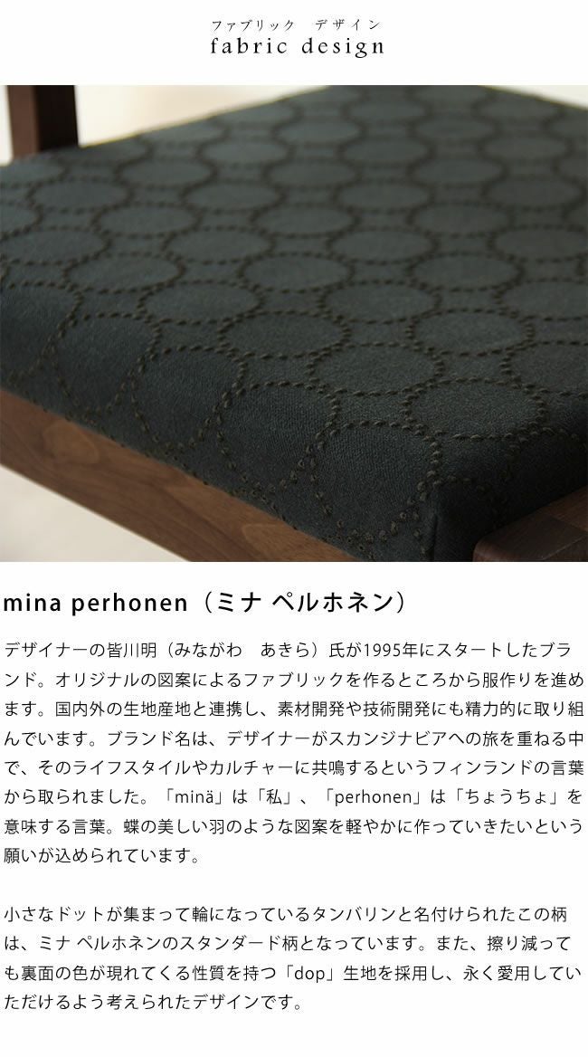 | 材質 | ・材 ウォールナット材 ・座面生地 ミナ・ペルホネン(dop) ポリエステル65%、綿35% ・クッション材 ダイメトロール、ウレタンチップ20mm、ウレタンフォーム5mm |