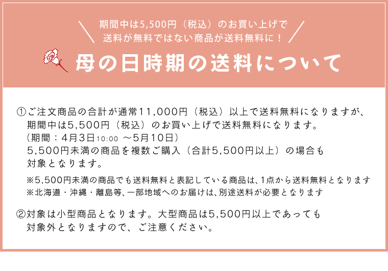 1件のご注文につき、地域別送料対象商品の合計金額が5,500円(税込)以上のお買い上げで送料無料となります。(母の日キャンペーン期間限定)