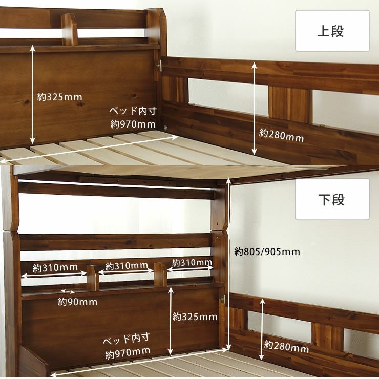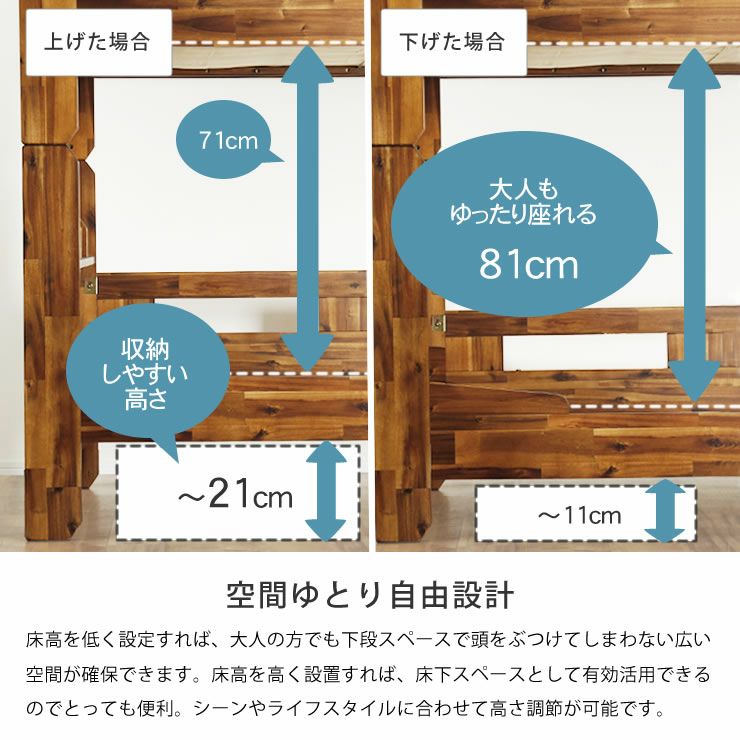 床高を変えられるナチュラルな無塗装の国産ひのき2段ベッド/二段ベッド